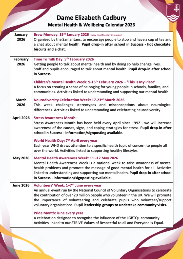 Each month, the calendar features events designed to promote positive mental health, encourage open conversations, and ensure pupils know where and how to seek support. Some events also aim to raise awareness or celebrate important occasions, such as Volunteers' Week. Pupils can take part in drop-in sessions, themed activities, and signposting to internal and external support, helping them feel supported, informed, and empowered.